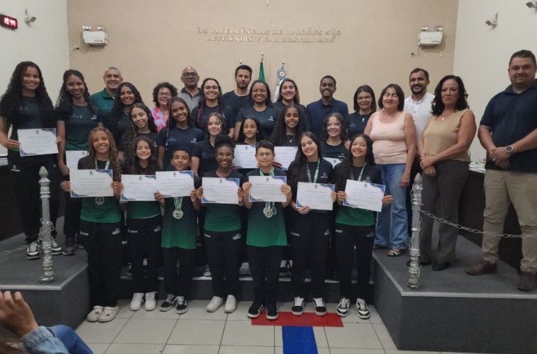 HOMENAGEM A ATLETAS | Na reunião ordinária desta semana, realizada na terça (23), 22 pessoas, entre atletas e comissão técnica, receberam Homenagem Especial da Câmara Ouro Branco pelo terceiro lugar no quadro geral de medalhas na modalidade olímpica de Ginástica de Trampolim no Torneio Nacional disputado em Maceió. A iniciativa foi dos vereadores Nélison José Alves e Warley Higino Pereira, conforme Regimento Interno da Casa Legislativa.