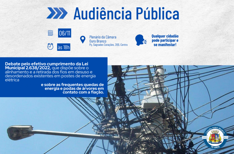 No dia 06/11, às 18h, a Câmara Municipal de Ouro Branco promove um debate importante sobre as frequentes quedas de energia, podas de árvores em contato com a fiação e o cumprimento da Lei Municipal 2.638/2022, que trata da retirada de fios em desuso e da organização nos postes de energia elétrica.
